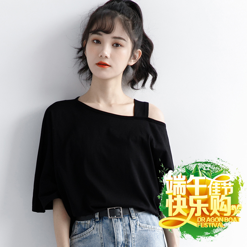 2021夏季新款小心机设计感吊带漏肩短袖T恤女宽松韩版黑色上衣潮热门设计联盟服务商