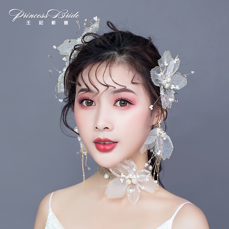 王妃新娘褶皱白纱花朵套装超仙唯n美白色珠串耳环浪漫婚纱拍照配热门设计联盟服务商