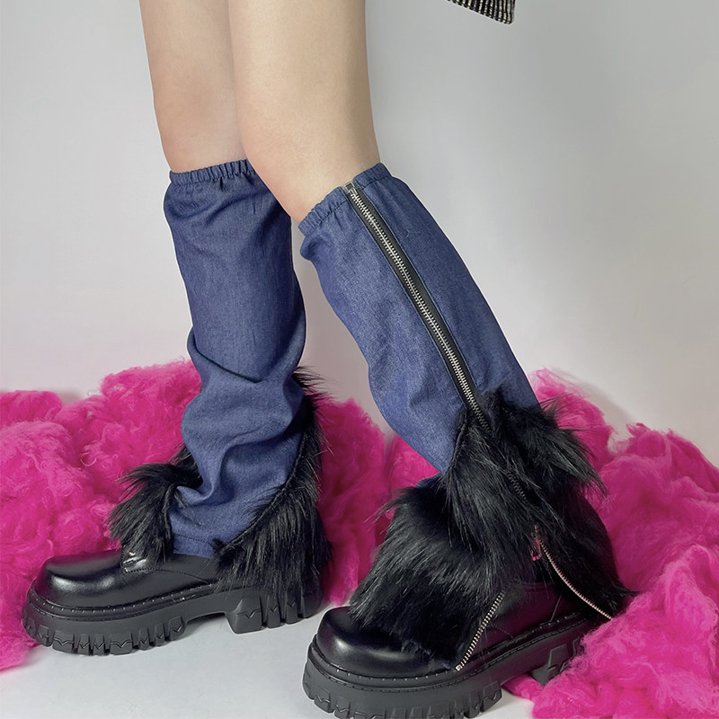 髦BING原创设计 y2k少女牛仔毛茸茸百搭千禧辣妹袜套小腿裤腿套热门设计联盟服务商